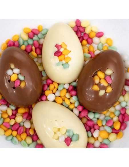 Met de hand gemaakt in ons atelier en gevuld met vrolijke, knapperige suikereitjes die zorgen voor kleur, textuur en een speels contrast met onze chocolade. Ze rammelen er op los met de lekkere suikereitjes binnenin!