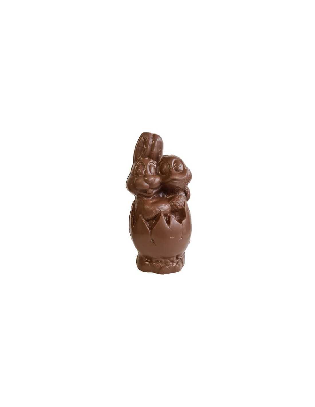 Deze 22 cm grote chocoladefiguur brengt een unieke combinatie van een paashaas en een eend in een opengebroken ei. Gemaakt van Belgische melkchocolade en ambachtelijk gegoten met oog voor detail. De volle, romige smaak en speelse vorm maken dit een echte blikvanger in elke paascollectie.