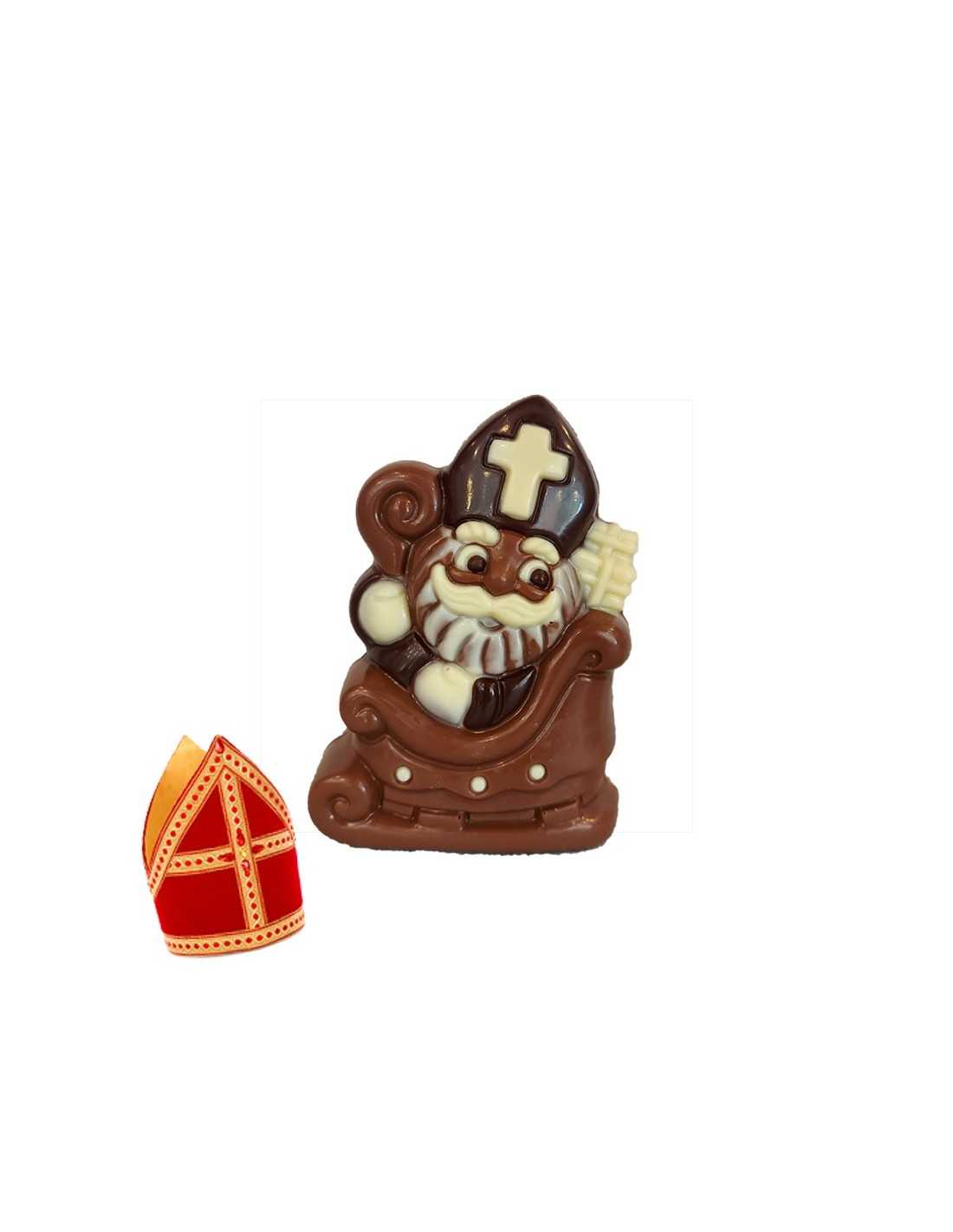 Ingekleurde chocolade Sint in slee, vervaardigd in melkchocolade van Callebaut. 9,5cm x 7cm