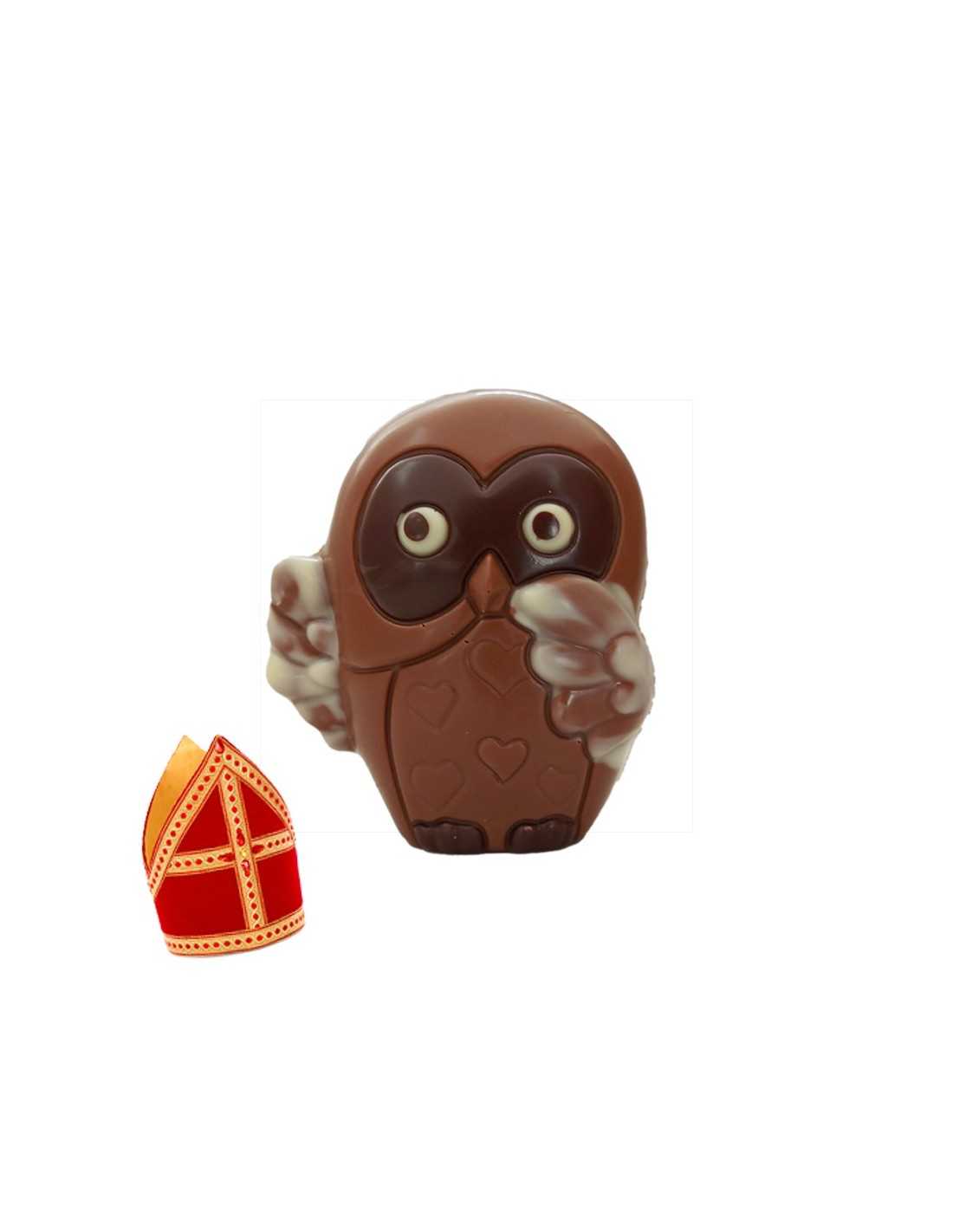Ingekleurd uiltje, vervaardigd in melkchocolade van Callebaut. 7,5cm x 6cm