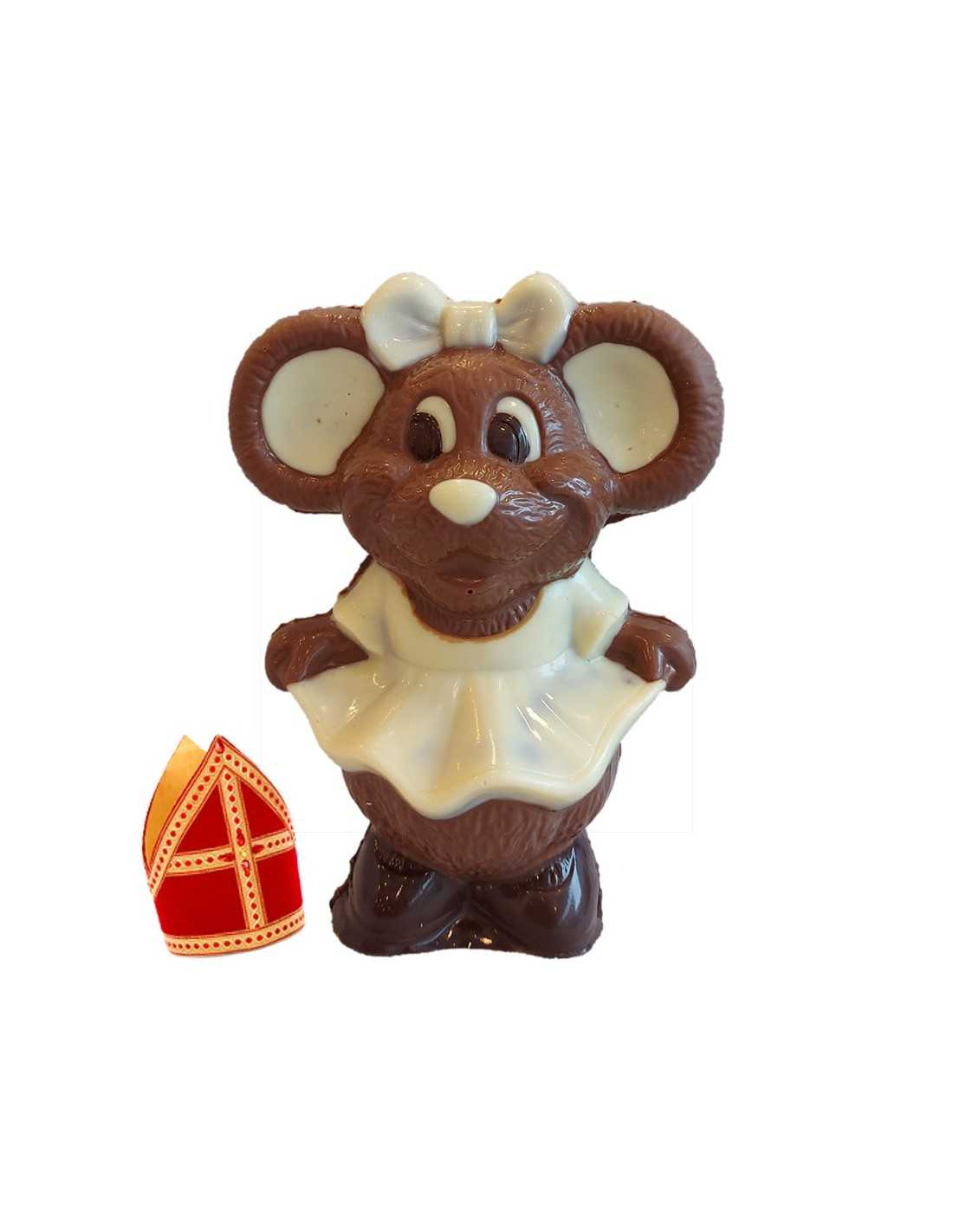 Ingekleurd muisje met strik, vervaardigd in melkchocolade van Callebaut. 17,5cm x 13,5cm